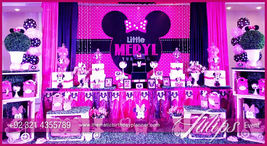 Minnie Mouse in pink and white polka dots is a timeless favorite! A big bow, ears, and hearts dominate the décor. Our Lahore-based team creates photo booths, arches, and customized cakes that bring Minnie to life.