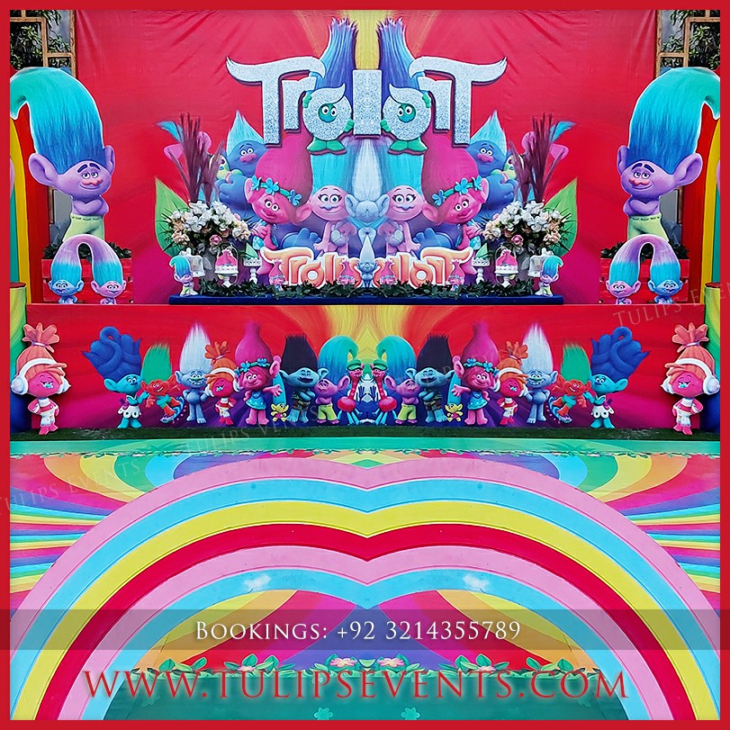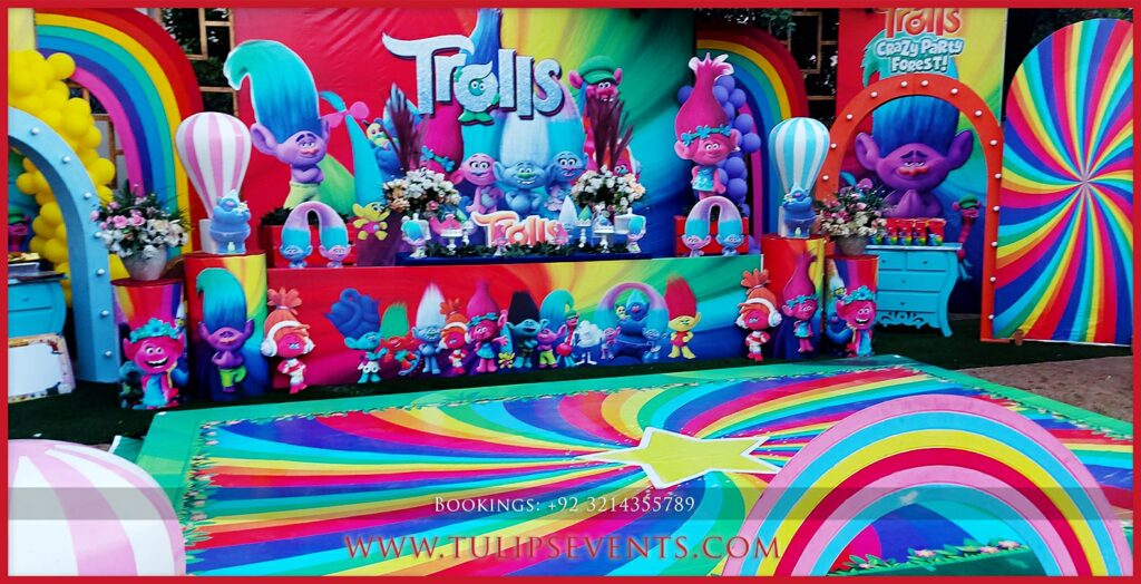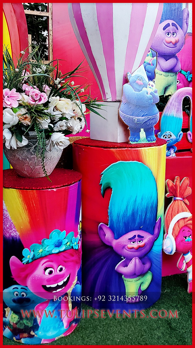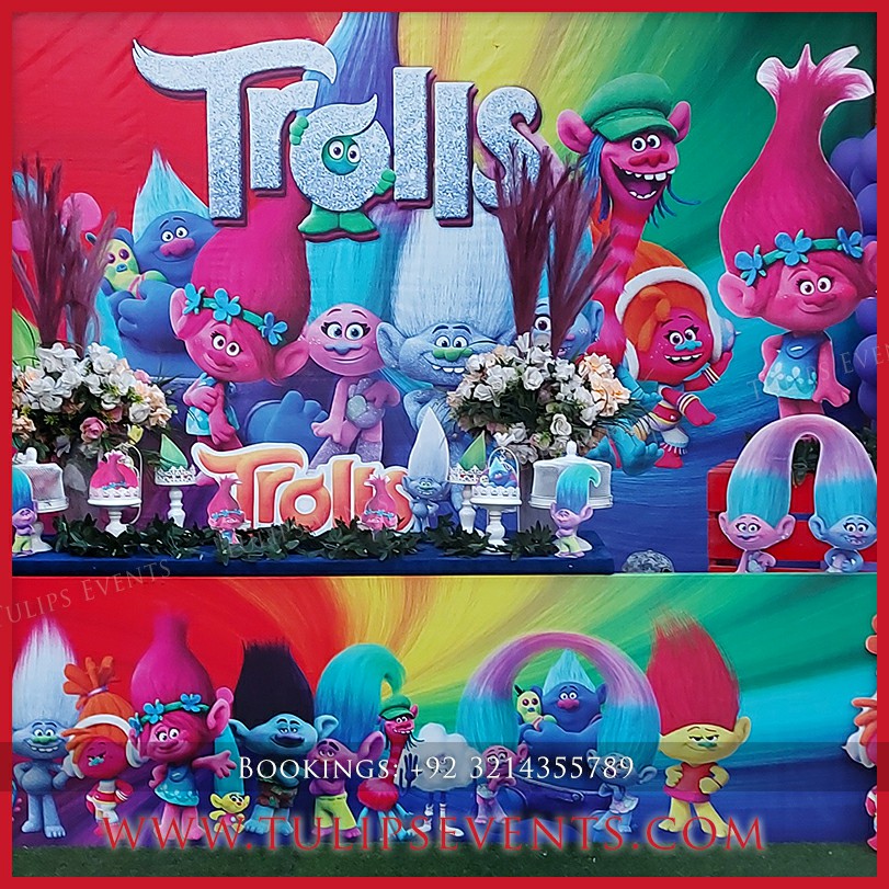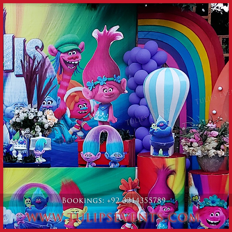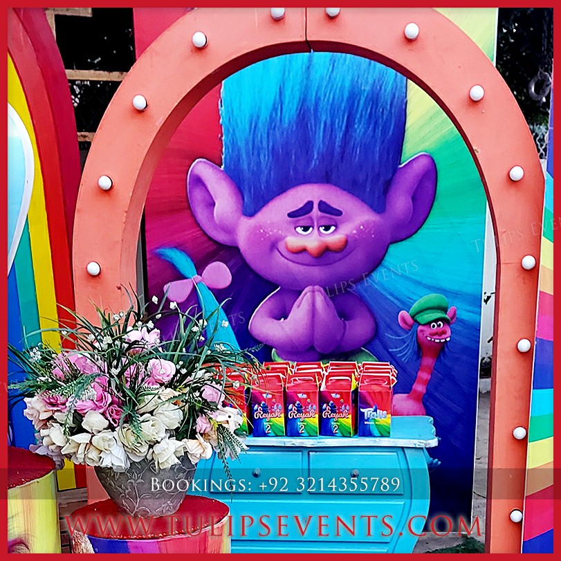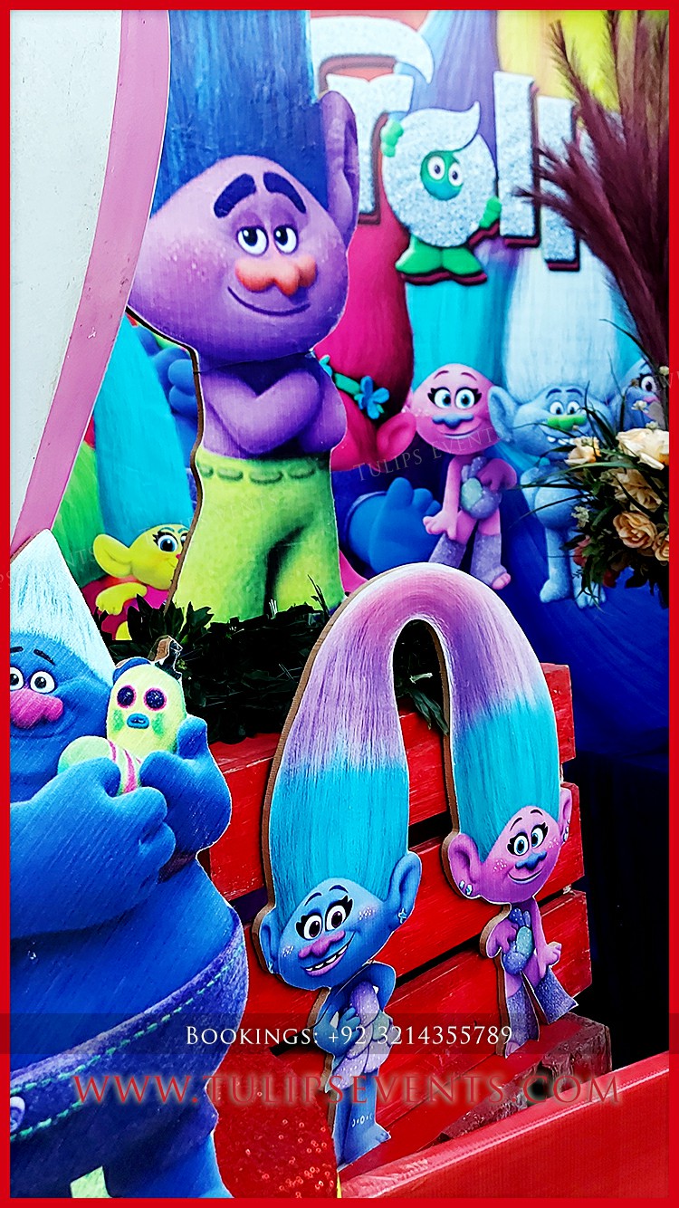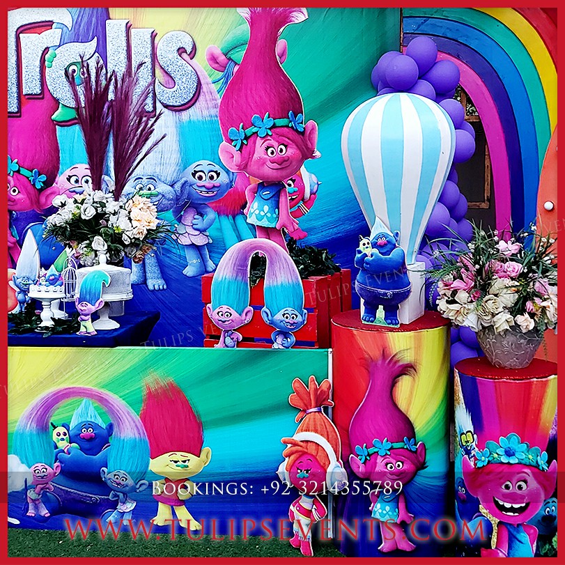 We giving you another amazing party that is Trolls theme birthday party decoration setup. 3D trolls party backdrop along with lots of trolls party props ideas in Pakistan.