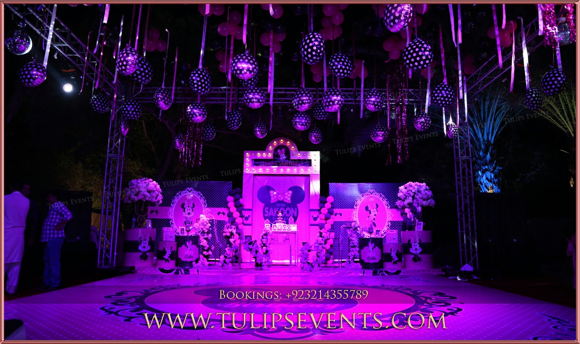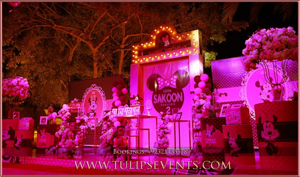 Minnie Mouse in pink and white polka dots is a timeless favorite! A big bow, ears, and hearts dominate the décor. Our Lahore-based team creates photo booths, arches, and customized cakes that bring Minnie to life.