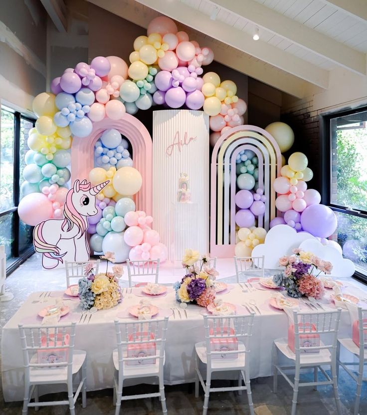 Celebrate joy, hope, and your baby girl’s colorful journey with a rainbow-themed party. Multi-colored balloon arches, soft cloud cushions, and a rainbow cake make this one of the most vibrant and cheerful themes.