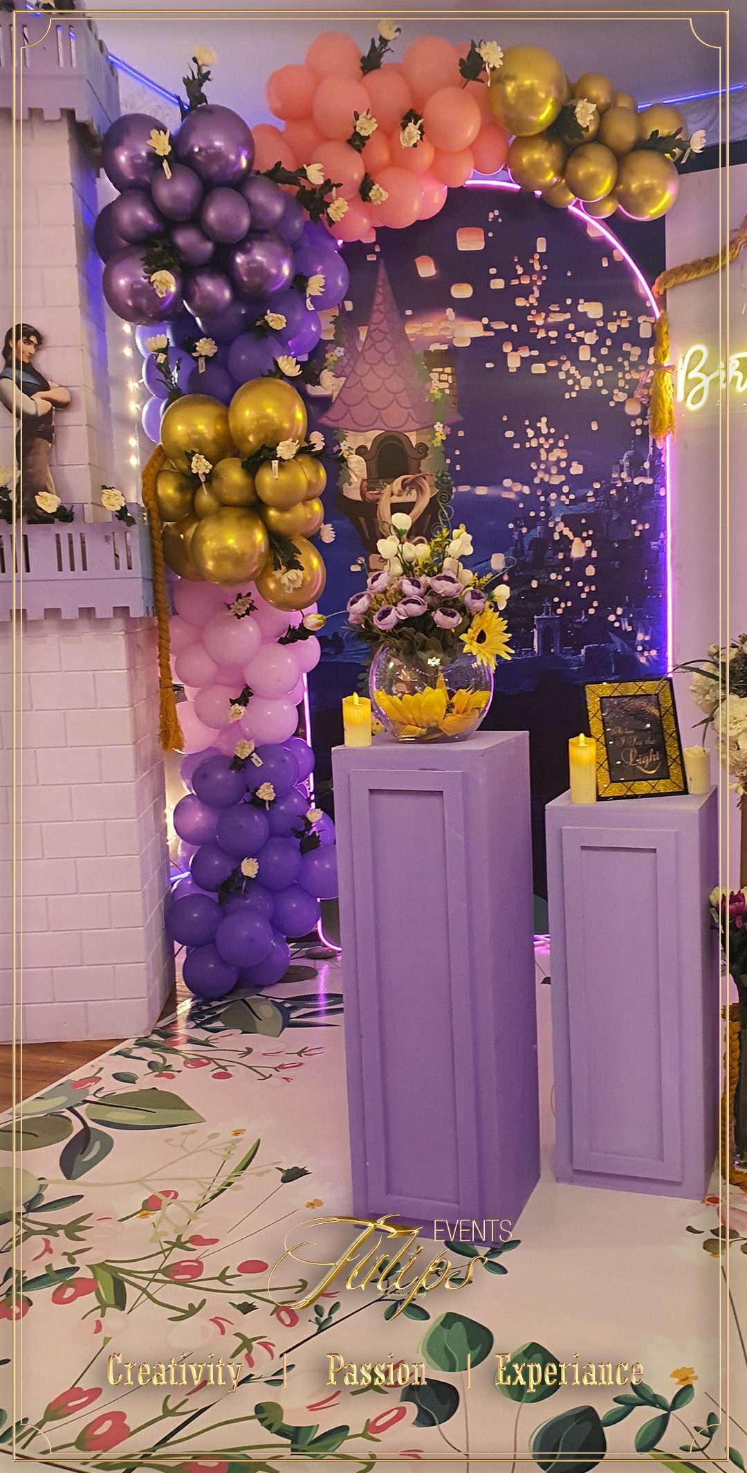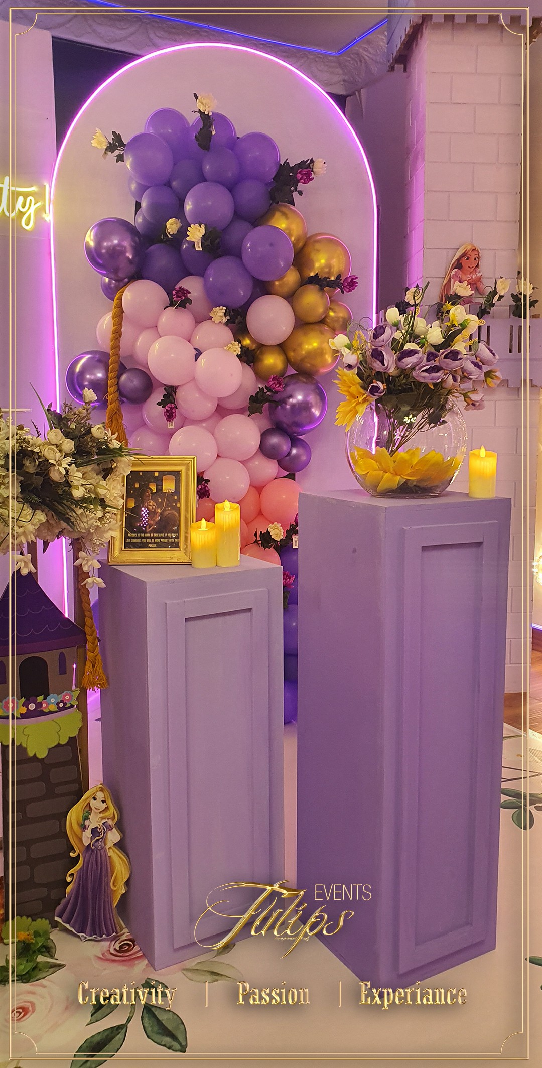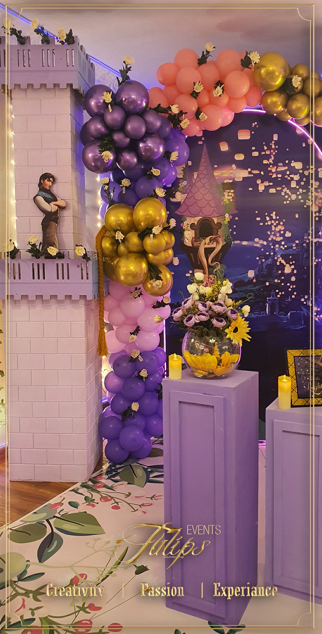 Rapunzel’s story is full of color, magic, and adventure — the perfect inspiration for a birthday party filled with wonder. From golden towers and magical lanterns to floral trails and dreamy purples, a Tangled theme allows for endless creativity in decor and setup.