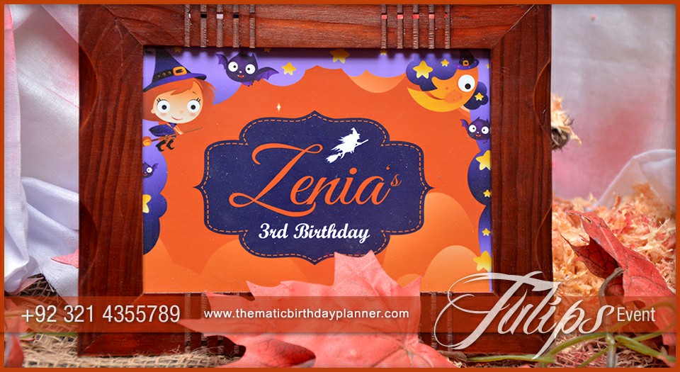 The backdrop that contains spooky Halloween background with hanging spiders, witch and all scary animals. backdrop also contains birthday baby name that you found in these ideas “Zenia’s First Halloween party”. Make you birthday venue either indoor or outdoor with skeletons, ghosts frames, ghouls and other small bugs decorations at all. Creepy cauldron o’bones, skeletal cats and glowing orange pumpkins that create perfect environment like hunted house. Tulips creative party planner gives Halloween ideas that can be funny or frightening.