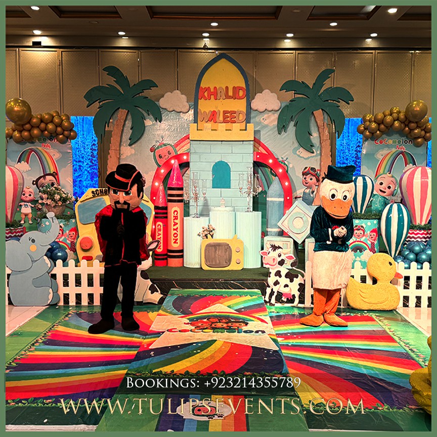 The cost depends on the theme, location, number of guests, and services included (like clowns, mascots, photographers, etc.). Packages typically start around PKR 15,000 and go up based on customizations. Contact us for a free quote.